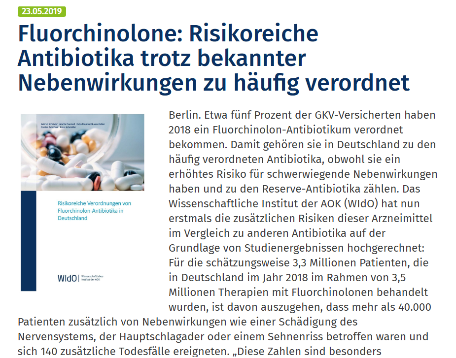 Der Bericht des Wissenschaftlichen Instituts der AOK (WIdO) untersucht die Verordnungspraxis von Fluorchinolon-Antibiotika in Deutschland und schätzt anhand vorhandener Studien ab, wie viele Patienten dadurch einem zusätzlichen Risiko für schwerwiegende Nebenwirkungen ausgesetzt sind. Fluorchinolone wurden 2018 trotz bekannter Risiken noch relativ häufig verordnet – etwa 3,3 Millionen Patient:innen erhielten sie, obwohl gut wirksame und risikoärmere Antibiotika verfügbar sind. Basierend auf epidemiologischen Hochrechnungen könnte dies zu mehr als 40.000 zusätzlichen Nebenwirkungen geführt haben, darunter vor allem neurologische Symptome, Sehnenrisse und Schädigungen der Hauptschlagader, sowie zu etwa 140 zusätzlichen Todesfällen, die durch andere Antibiotika hätten vermieden werden können. Die Analyse kritisiert, dass Fluorchinolone oft nicht als Reserve-Antibiotika, sondern auch bei leichteren Infektionen eingesetzt werden und fordert eine stärkere Berücksichtigung der Risiken durch Ärzt:innen, bessere Patientenaufklärung und mehr Verantwortung der pharmazeutischen Hersteller im Umgang mit bekannten Sicherheitsproblemen.