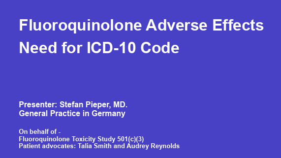 Das Positionspapier „Fluoroquinolone Adverse Effects – Need for ICD-10-CM Code“ wurde von Stefan Pieper, Facharzt für Allgemeinmedizin in Deutschland, vor dem Centers for Disease Control and Prevention (CDC) präsentiert. Die Präsentation erfolgte im Auftrag der Fluoroquinolone Toxicity Study 501(c)(3) unter Mitwirkung der Patientenvertreterinnen Talia Smith und Audrey Reynolds. Vorgestellt wurden behördliche FDA-Auswertungen und klinische Sicherheitsanalysen, die zeigen, dass Fluorchinolon-Antibiotika schwere, teils dauerhafte Multisystem-Schäden verursachen können, die häufig nicht durch Standarddiagnostik nachweisbar sind. Ziel der Präsentation war die Begründung eines eigenen ICD-Primärcodes zur korrekten Erfassung fluorchinolon-assoziierter Vergiftungen.
